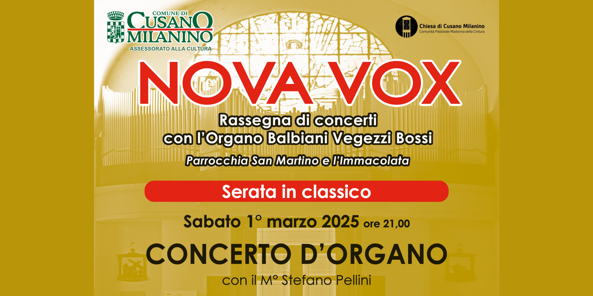 L’Assessorato alla cultura, in collaborazione con la Parrocchia San Martino e l’Immacolata, propone anche quest’anno la quarta edizione di “Nova Vox“, concerti di musica classica e contemporanea realizzati con il prestigioso organo, divenuto patrimonio artistico e culturale di Cusano Milanino.